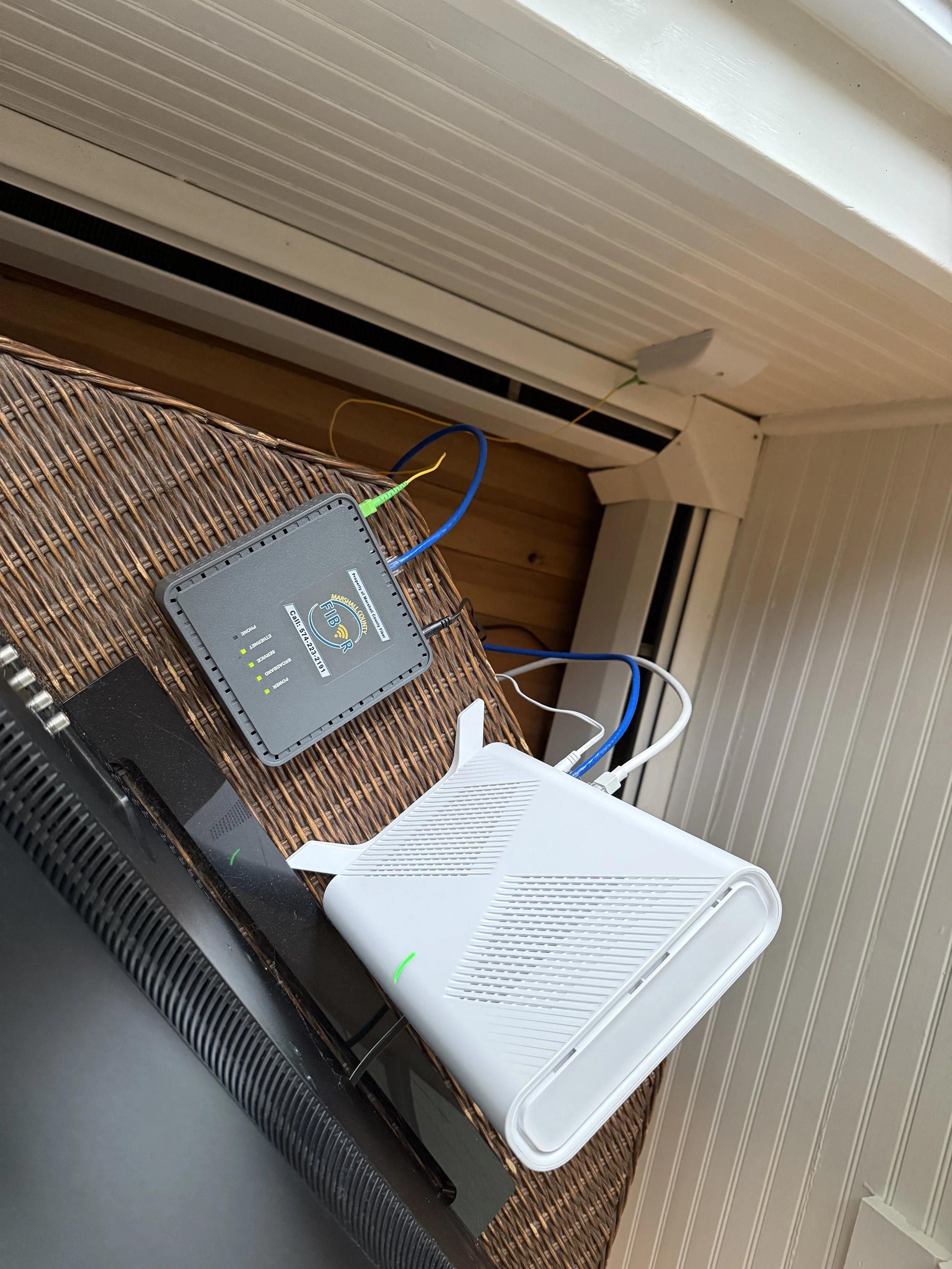 The small black box behind the TV is the modem from RTC. The White tall instrument is the WiFi Router. The TV’s have already been logged in to the router, although, we all know that sometimes we have to go back and do it again, like after a power outage.
